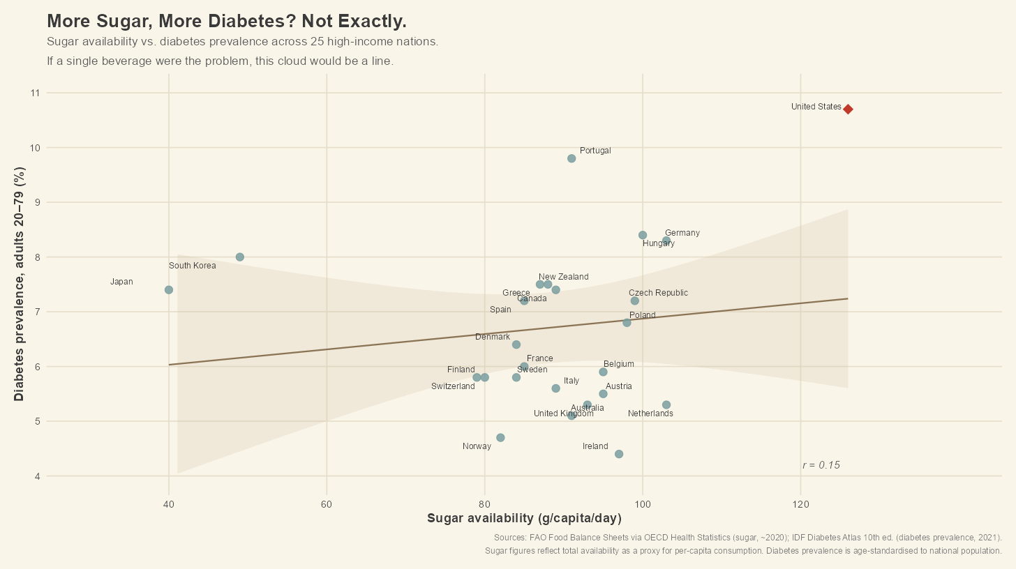 Plotting sugar availability per capita against type 2 diabetes prevalence across 25 high-income nations, using FAO food supply figures and IDF Diabetes Atlas estimates, gives us a correlation of 0.15. Sugar availability explains roughly 2% of the variation in diabetes prevalence among these countries. The United States sits where you would expect, high sugar and high diabetes, and if you look at it quickly, it seems to support Kennedy’s case. Germany and the Netherlands consume sugar at nearly the same levels as Americans, yet they land almost smack dab below the United States on diabetes. Portugal consumes less sugar than the United States and nearly matches its diabetes rate. Japan and South Korea consume far less sugar than any Western European country and still exceed seven percent prevalence, higher than several nations eating considerably more. What you get when you plot this is a cloud, not a line, but the cloud is the point.